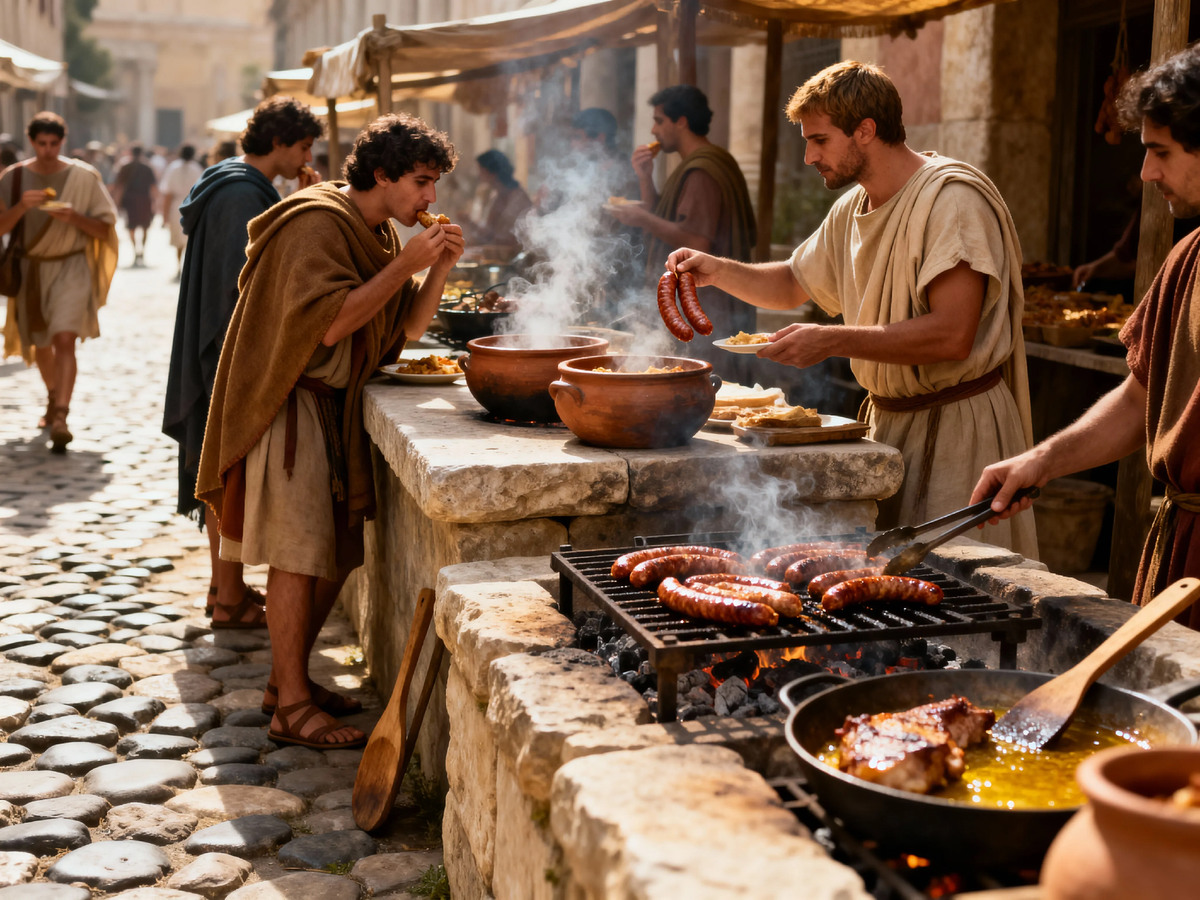Иногда правду о прошлом легче увидеть в запахе и движении улицы, чем в витринах дворцов. Под ногами — камень, над головами — дым от жаровен, а вокруг — котлы, где готовят быстро и дёшево. Именно так жилы города наполнялись повседневной едой: не пиры патрициев, а походный обед, который уложил в себе ритм жизни огромного мегаполиса.
