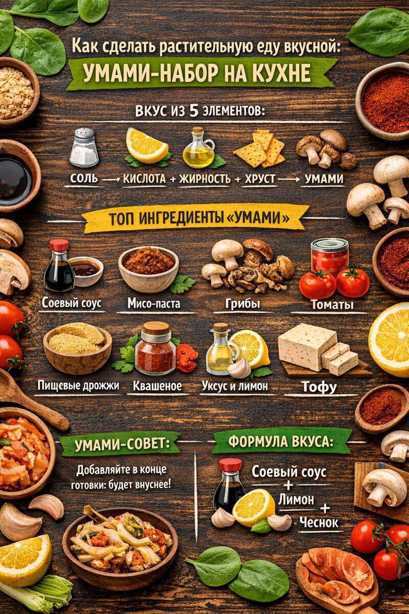 Иногда кажется, что растительная еда недоходит до нужной глубины вкуса. Это ощущение часто появляется из-за нехватки той самой глубины, которая заставляет блюдо звучать полноценно. Такую глубину возвращает умами — вкус, который воспринимается как насыщенность и мясистость, и его легко собрать на растительной кухне.