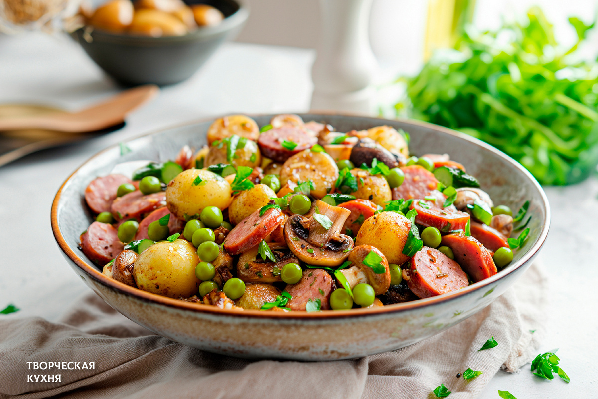 Для соуса необходим оливковое масло, горчица и вустерский соус, которые смешиваются в отдельной миске. Затем картофель, нарезанная краковская колбаса, шампиньоны, огурцы и зелёный горошек укладываются в салатник. Поливают соусом и аккуратно перемешивают. Последний штрих — посыпка рубленой зеленью для красивой подачи.