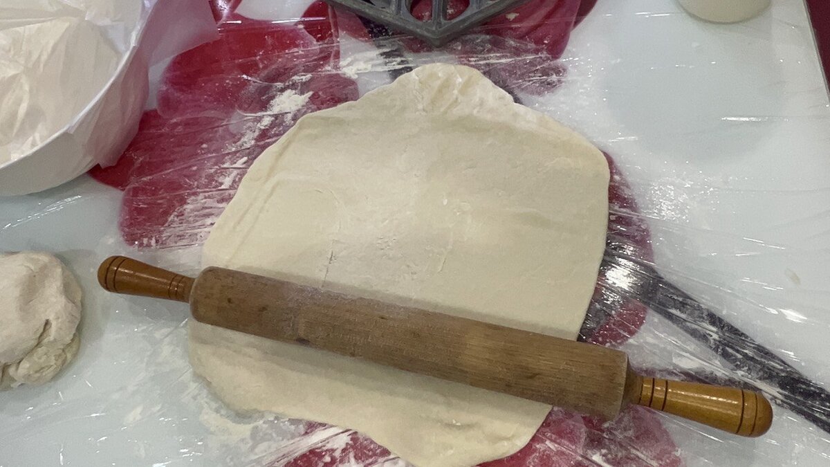 Приступим к формированию вареников. Объемное тесто разделите на небольшие кусочки и раскатайте их на столе с помощью скалки. Вырежьте кружки, используя стакан или формочку.