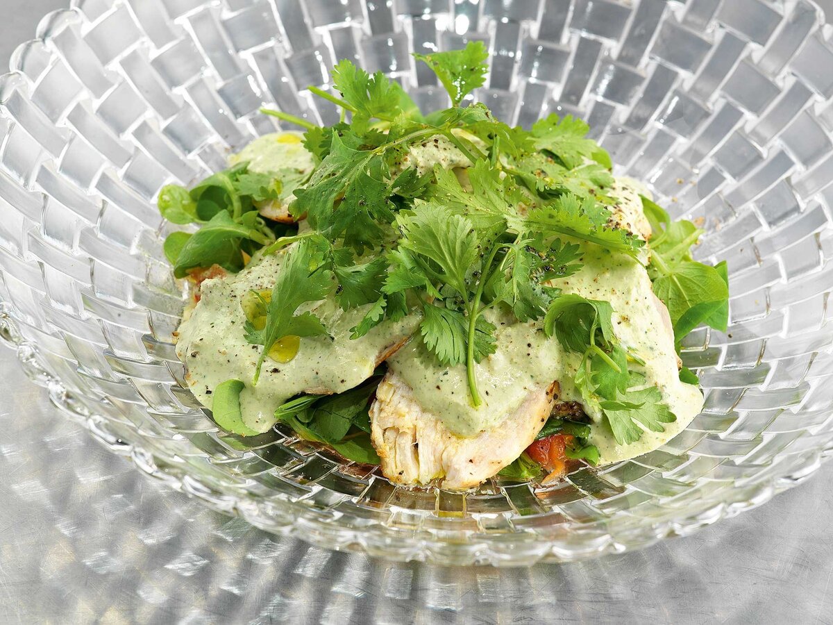 Томаты нарезать, посыпать перцем и морской солью, полить 40 мл оливкового масла, добавить тимьян. Запекать в разогретой до 180 градусов духовке в течение пяти минут, затем оставить на три часа в прохладном, проветриваемом месте.В вакуумный пакет положить розмарин, раздавленный чеснок, ольховый дым и 40 мл оливкового масла. Добавить немного соли, поместить в пакет грудку цыпленка, запаять и готовить в режиме конвекции в духовке при 100 градусах на протяжении 30 минут. После этого нарезать копченого цыпленка тонкими ломтиками.В блендере смешать сметану, орехи, чеснок и листья кинзы (несколько веток отложить для украшения). Измельчать до однородности, при необходимости добавив молоко для достижения нужной консистенции.Смешать листья корна с подсушенными томатами и выложить в центр тарелки, сверху разместить ломтики цыпленка, полить соусом сациви и украсить оставшимися листьями кинзы.