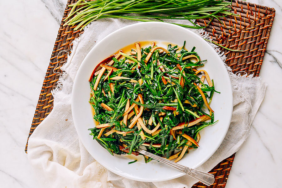 Начните с приготовления соуса – просто смешайте все его ингредиенты в небольшой миске.Имбирь и чеснок нарежьте мелкими соломками, а джусай и тофу – крупнее.Разогрейте сковороду на среднем огне с одной столовой ложкой растительного масла. Обжарьте имбирь и чеснок до появления аромата, это займет всего несколько минут.Осторожно добавьте нарезанный тофу и обжаривайте его около минуты, помешивая.Увеличьте огонь до максимума и добавьте джусай. Обжаривайте еще минуту, затем влейте подготовленный соус. Готовьте еще полминуты, приправив солью по вкусу. Блюдо готово!Приятного аппетита!