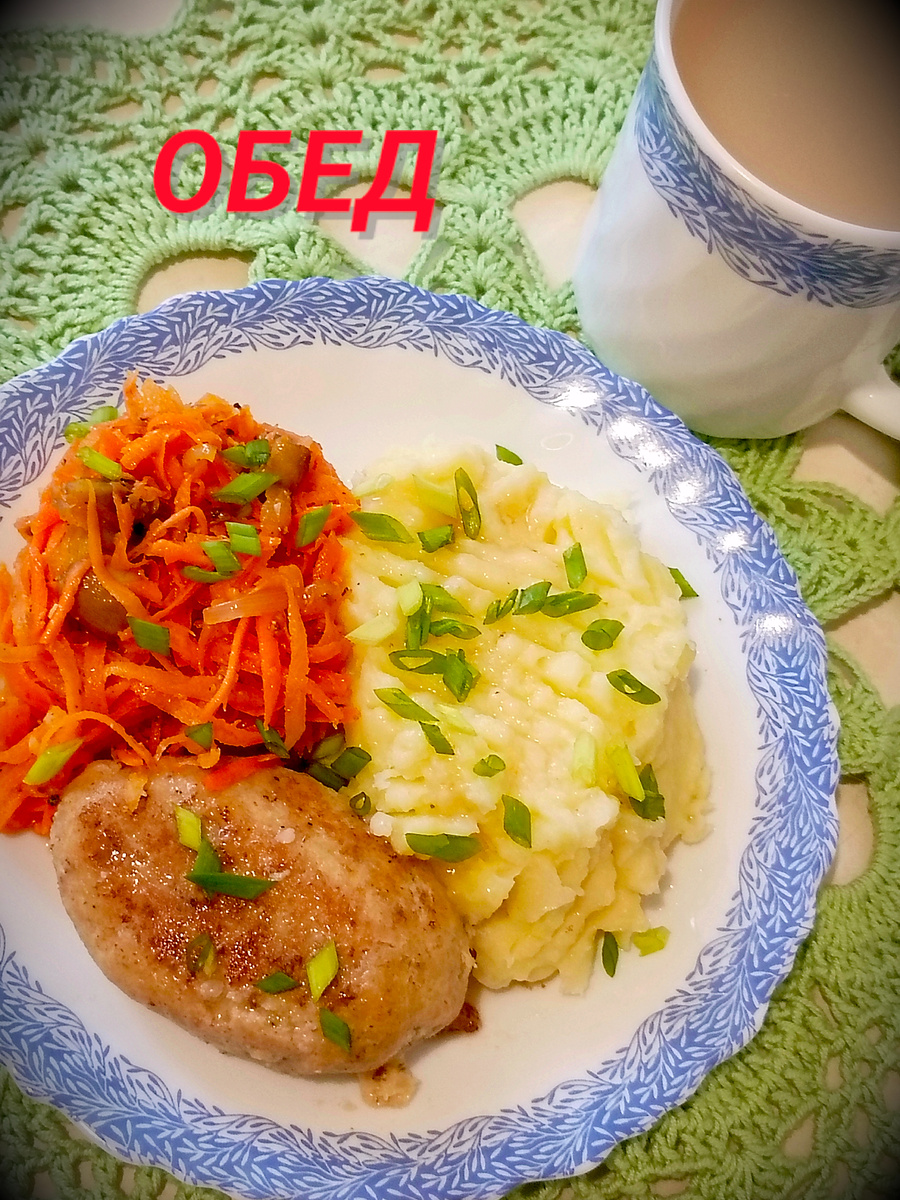 В дополнение к основной тарелке приготовлен яркий и пикантный салат из моркови по-корейски с грибами. Такой контраст текстур и вкусов действительно стал гвоздем всего обеда. Хрустящая морковка, пряный соус, дополняющий вкус грибов, вызывает неподдельный интерес и желание попробовать еще.