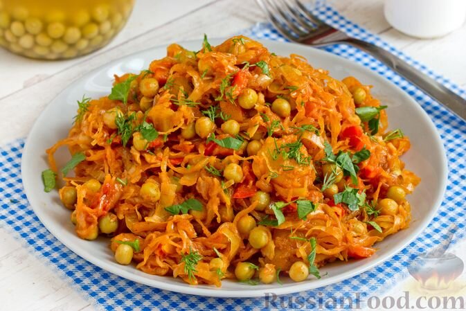 Не забудьте о картошке, тушенной с капустой и консервированным горошком. Добавление сладкого перца и томатной пасты придаёт этому овощному блюду новый уровень. Оно становится ярким и очень аппетитным!