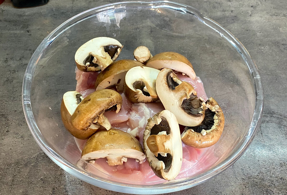 Мясо необходимо поместить в миску вместе с нарезанными на половинки шампиньонами. Затем влить маринад, добавить растительное масло, тертый чеснок, паприку, молотый перец и соль. Все ингредиенты следует тщательно перемешать, стараясь не повредить грибы. Закрыть пленкой и оставить мариноваться на 2 часа в холодильнике.