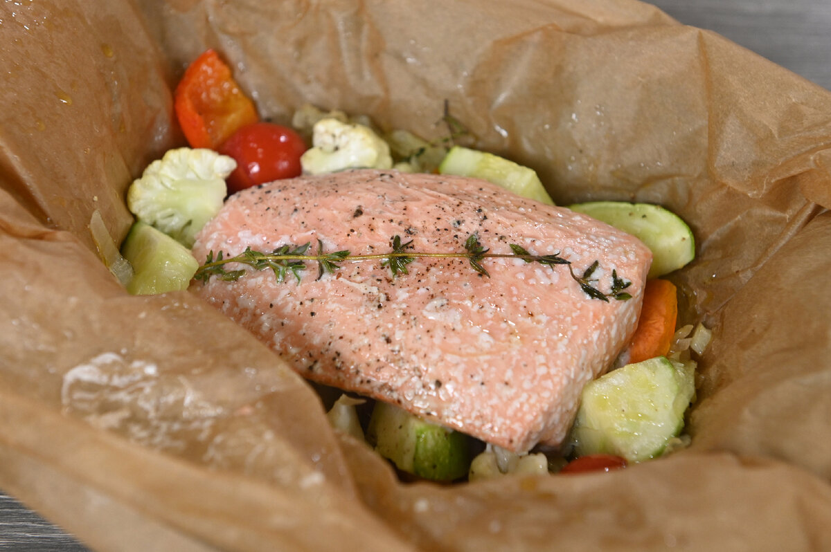 Нарезать репчатый лук полукольцами и обжарить на сковороде с оливковым маслом и веточкой тимьяна до мягкости. По мере выделения сока добавить немного сахара и перемешать, подливая масло.Очистить болгарский перец от семян, нарезать кубиками и поместить в глубокую миску.Разобрать цветную капусту на мелкие соцветия и добавить к перцу.Нарезать морковь тонкими дисками и добавить к овощам.Снять томаты черри с веточки и положить целиком в миску с остальными овощами, добавив немного оливкового масла.Кабачок нарезать крупными кусочками и соединить с другими овощами.Подготовить длинный лист пергамента, сложить его пополам и выложить обжаренный лук на нижнюю половину.Полить свежие овощи оставшимся маслом и выложить их на лук. Поверх овощной подушки разместить филе лосося, посолить и поперчить по вкусу, добавив веточку тимьяна и полив оливковым маслом.Закрыть пергамент, оборачивая его со всех сторон, и запекать в заранее разогретой до 180 градусов духовке в течение 20 минут. Приятного аппетита!