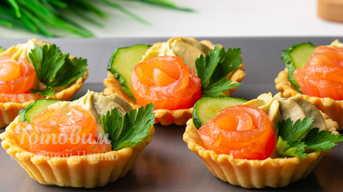 5. Установите «розочки» из рыбы в каждую тарталетку сбоку.
