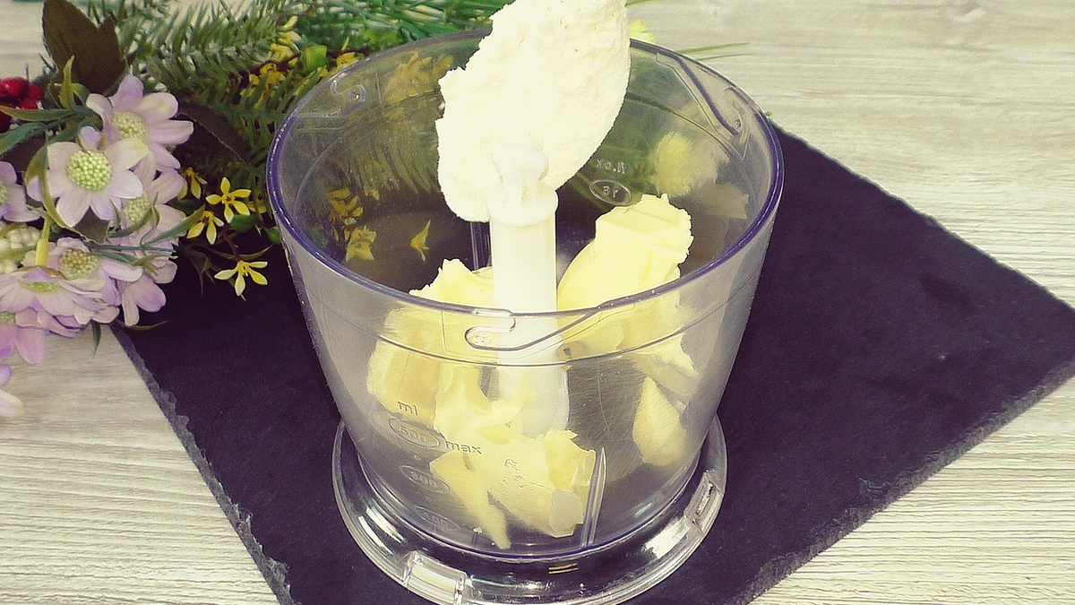 Для начала необходимо подготовить тесто. В блендере объединяются все сухие ингредиенты (мука, соль, разрыхлитель) и кусочки холодного масла, пока не образуется крошка. Затем добавляется сахар и ванилин. Включив блендер на несколько секунд, получается однородная масса, которую стоит пересыпать в миску.