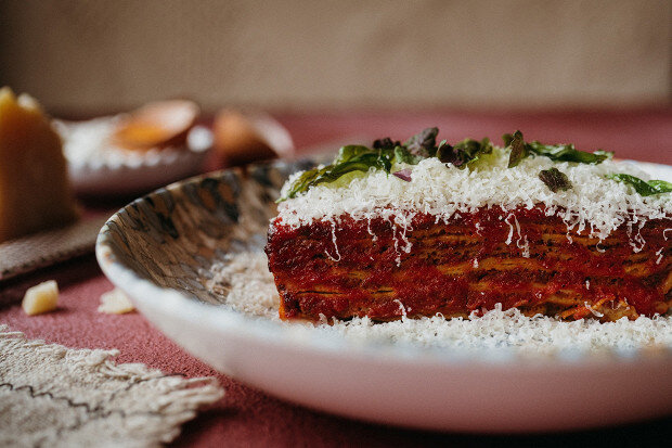 8. Собрать лазанью в огнеупорной форме, чередуя слои блинов, рагу и соусы. Закрыть фольгой и запекать 25–30 минут при температуре 200°C.