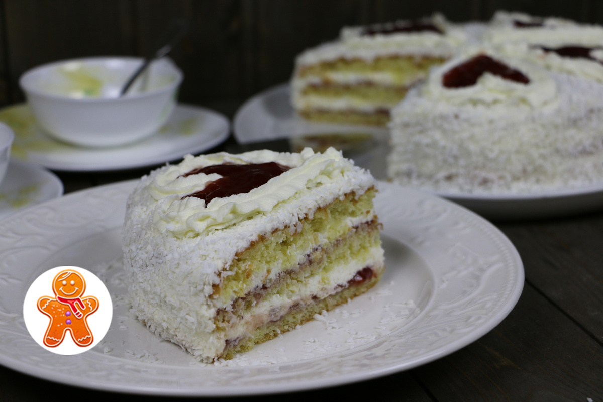 Пока корж остывает, следует приготовить крем. Взбить холодные сливки с сахаром и закрепителем, добавив ванильный экстракт. Затем разрезать остывший бисквит на 2-3 коржа, смазывая каждый конфитюром и кремом. В завершение украсить торт оставшимися взбитыми сливками и посыпать кокосовой стружкой.