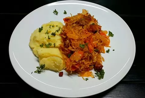 Прежде всего, отожмите квашеную капусту, избавив её от лишнего рассола. После этого нарежьте мелкими кубиками копченую грудинку и лук, а морковь — толстыми кругами. Разогрейте сковороду и обжаривайте грудинку до тех пор, пока не начнет выделяться ароматный жир. Добавьте лук и жарьте до полупрозрачности, после чего добавьте морковь и продолжайте готовить ещё 5 минут.