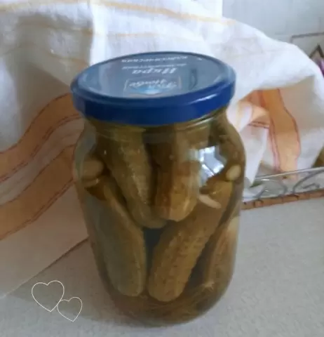 После этого в банку помещается около 10-12 огурцов, плотно укладывая их вертикально. Затем заливаются кипятком и оставляются для прогрева на 10 минут. Вода, которая остынет, будет использована для приготовления рассола с добавлением соли, сахара и уксуса. Горячим рассолом заливаются огурцы до краев, банки закатываются и укрываются для остывания.
