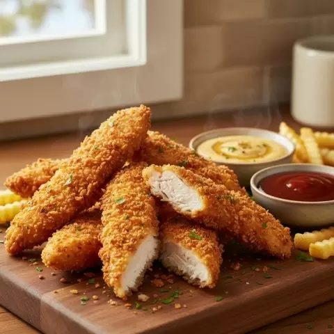 Хрустящие куриные стрипсы — это непревзойденное сочетание нежного куриного филе и аппетитной золотистой корочки. Благодаря маринаду на основе пахты куриное мясо становится невероятно мягким и сочным. Однако именно двойная панировка из сухарей Панко создает тот самый восхитительный хруст, о котором мечтает каждый гурман. Это идеальное блюдо для уютного вечера с друзьями или для семейного ужина!