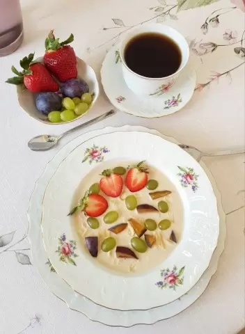 3. Разлить суп по тарелкам, посыпать миндальными лепестками и добавить виноград кишмиш, а также украсить половинками клубники и кусочками сливы.