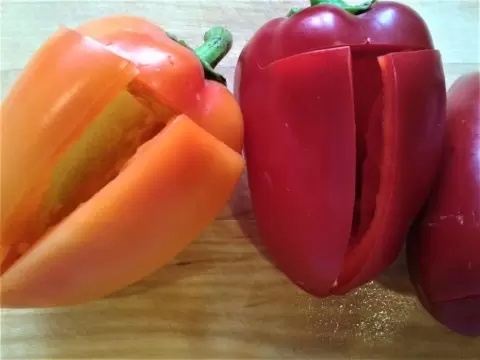 Начнем с подготовки сладких перцев. В отличие от традиционных методов, в этом случае фрукты требуют немного иной обработки. Сначала следует сделать поперечный надрез, чтобы удалить семена, а затем продольный разрез, образующий букву "Т". Такой подход обеспечивает лёгкий доступ к внутренней части плода, что делает процесс начинения более удобным. После этого перцы стоит промыть под проточной водой, чтобы избавиться от лишних остатков семян.
