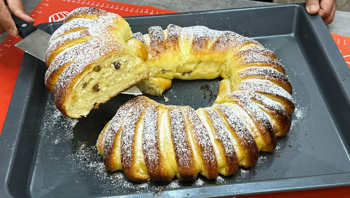 - На другой половине сделайте надрезы, сверните в рулет, придайте ему форму кольца и оставьте для расстойки еще на 20 минут.