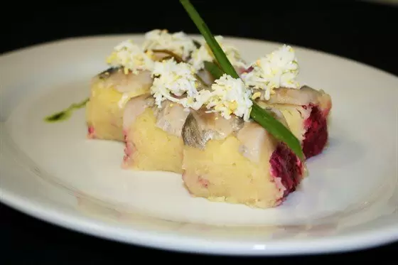 Не забываем о яйцах: их тоже нужно сварить, остудить и разделить на белки и желтки. Затем белки трут на терке. Сельдь — ключевой ингредиент: половину её нужно мелко нарезать, а оставшуюся часть — красиво порезать пластинами.