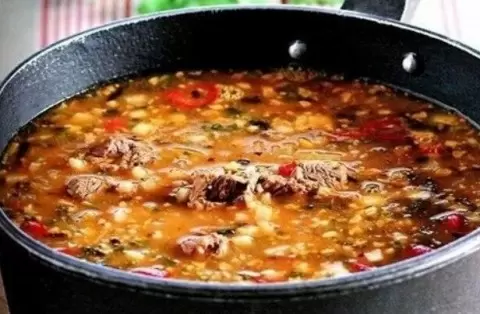 - В суп добавляют обжаренный на растительном масле лук, орехи, соус ткемали или тклапи (из сушеных слив), хмели-сунели, молотый красный и черный перец.
