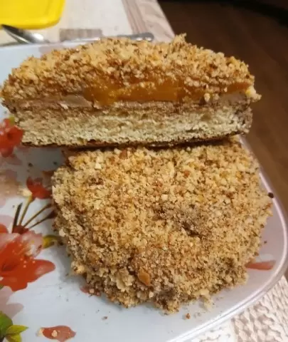 Остывший бисквит срезать на квадраты или кружки, аккуратно удалив верхнюю корочку. На каждый корж выложите слой крема, затем — слой тыквенного джема. Обмажьте боковые стороны кремом и обваляйте в крошке от бисквита. Для усиления вкуса и разнообразия украсьте по своему желанию.
