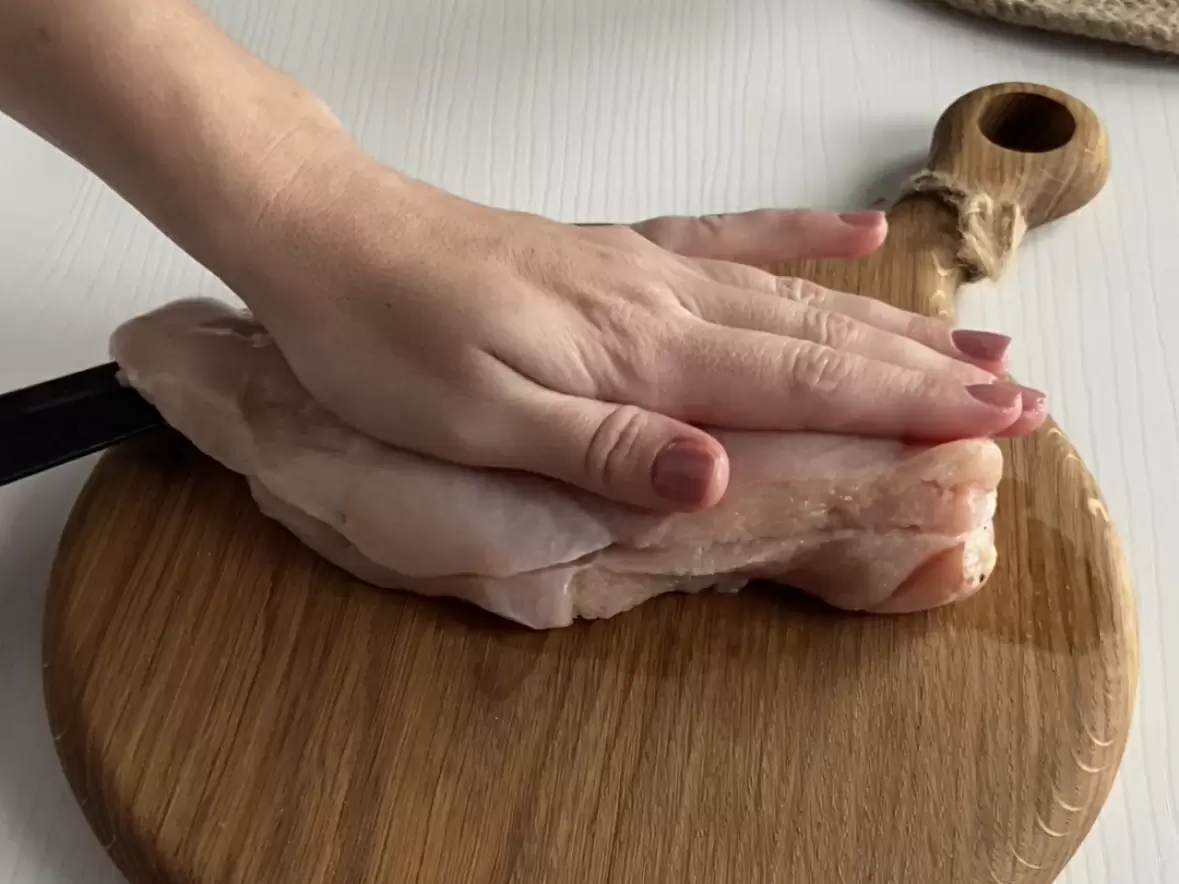 Начинать следует с подготовки куриной грудки, нарезая её тонкими пластинами, примерно 1 см толщиной. Затем можно отбить каждый кусочек, чтобы сделать мясо более нежным и сочным.