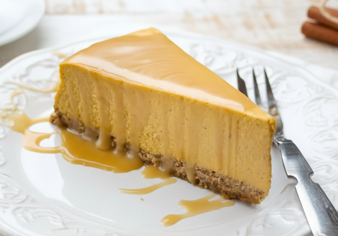 Готовый десерт рекомендуется полить слегка остывшей карамелью, которая должна оставаться мягкой. Наслаждайтесь вкусным и полезным тыквенным чизкейком!