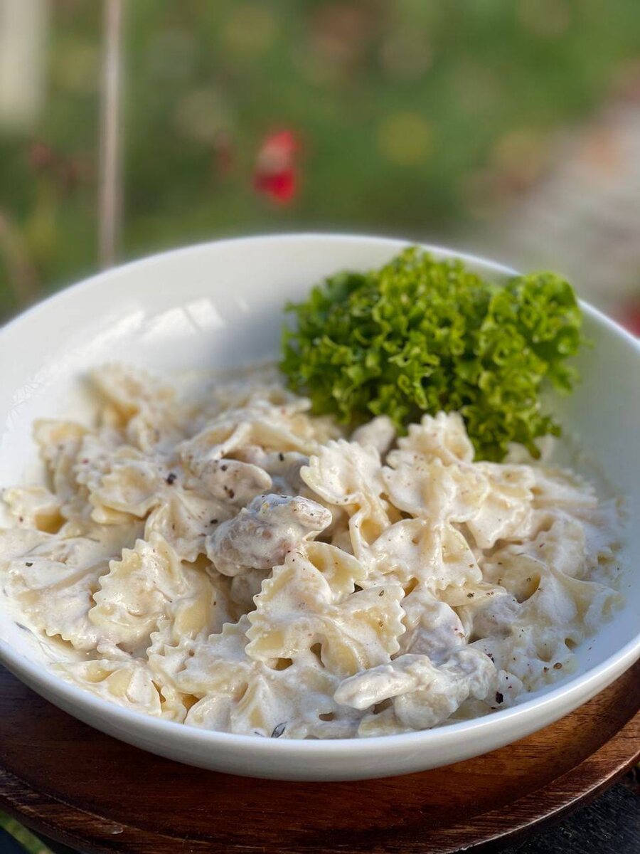 Блюдо готово к подаче! Переложите фарфалле с курицей в сливочном соусе на красивую тарелку и наслаждайтесь искренними комплиментами от ваших близких.