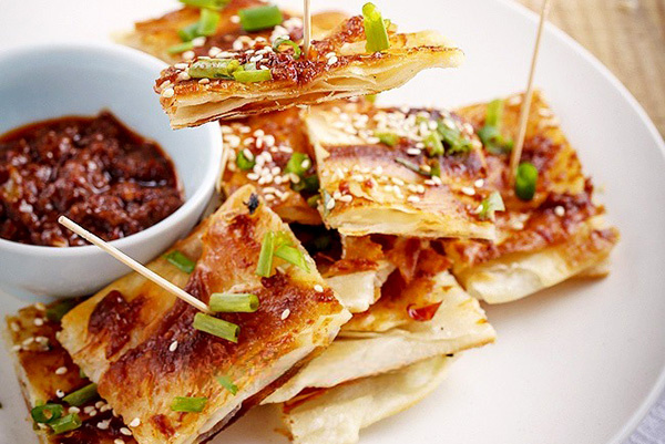 После жарки лепёшка обильно посыпается кунжутом и свежим луком, что добавляет новые акценты к уже готовому блюду. Эти простые компоненты делают её ещё более приятной и завершенной: хрустящий кунжут и ароматный лук — идеальное сочетание.