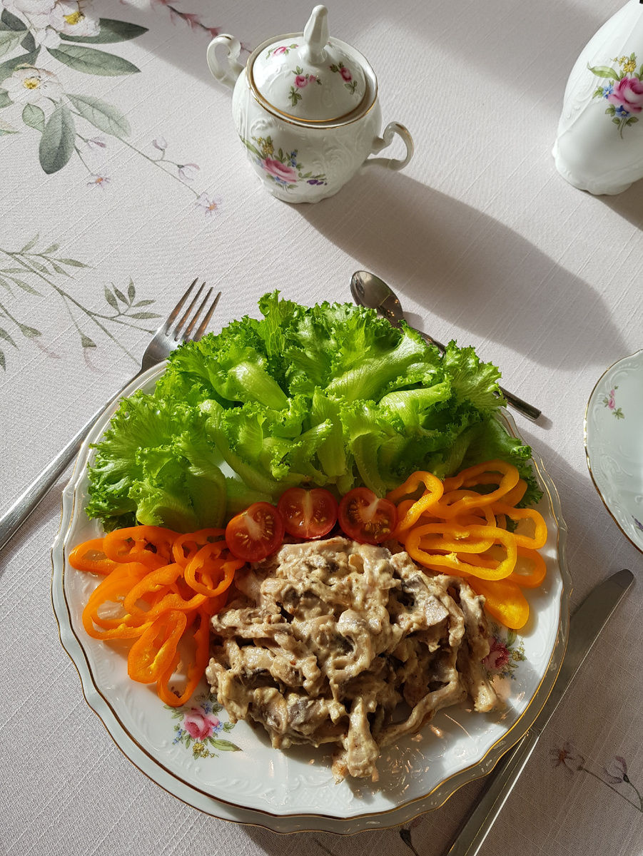 5. В конце сервировать фрикасе с листьями салата, сладким перцем и помидорами черри. Приятного аппетита!