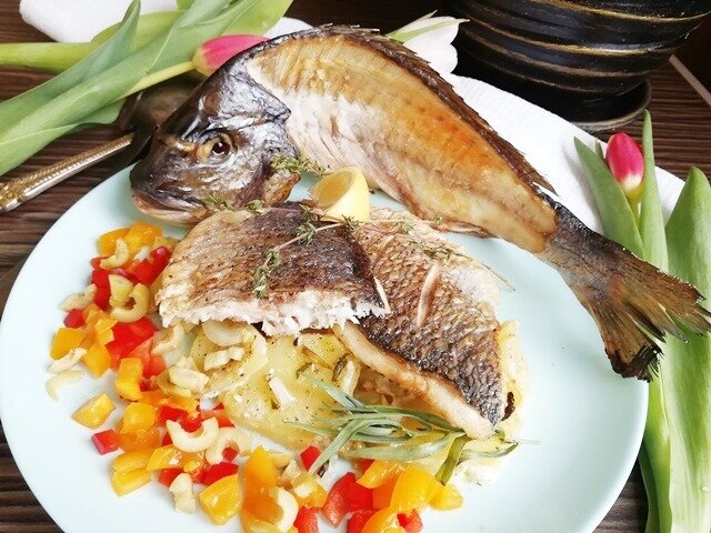 Когда все будет готово, выкладываем на тарелку картофель, сверху помещаем дорадо и подаем с свежими овощами и оливками. Блюдо получилось невероятно нежным и сочным! Приятного аппетита!