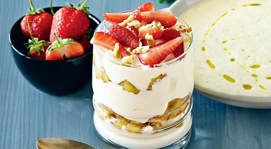 Шаг 2: В стаканы для виски выложить по 2 столовые ложки натурального йогурта, затем половину карамелизированных бананов, снова йогурт и оставшиеся бананы. Украсить измельченными грецкими орехами и свежими ягодами.