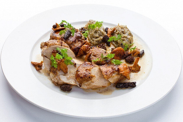Куриные части следует хорошо посолить и поперчить. Обжарить в сотейнике на сливочном масле так, чтобы кожа стала хрустящей. Затем перевернуть, влить белый херес и накрыть крышкой. Через 2 минуты достать крылья, через 5 минут - окорочка, ещё через 5 – филе. Процедить оставшуюся жидкость: это станет соусом для курицы.Лисички обжарить на сливочном масле, в то время как сморчки предварительно замачиваются и отвариваются. После этого добавить сморчки к лисичкам.Когда куриное мясо остынет, отделить его от костей. Затем снова обжарить на коже в сотейнике до возникновения красивого золотистого цвета. После перевёртывания влить соус и через 5 минут добавить обжаренные грибы.Подготовить картофель: отварить в мундире с добавлением тимьяна, чеснока и соли. Когда клубни будут готовы, очистить их и, пока они ещё горячие, пройтись толкушкой до состояния пюре. Затем добавить немного соли, молоко, сливочное масло и трюфельную пасту по вкусу, а также пассированный лук-шалот.Это блюдо сочетает в себе изысканные вкусы и ароматы, которые гарантированно удивят и порадуют любого гурмана.