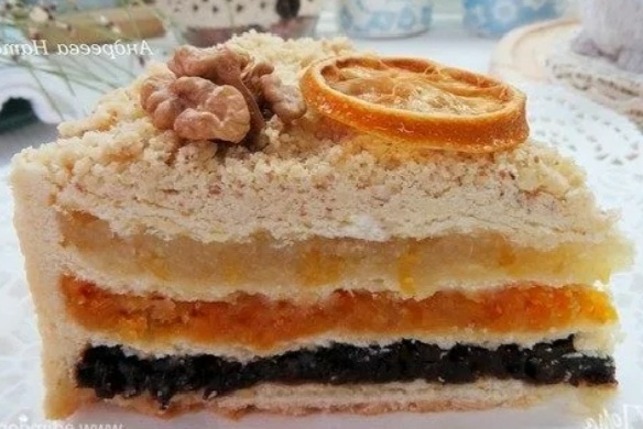 - 1-й слой: грецкие орехи — 150–200 г + сахар — 50–100 г по вкусу;
