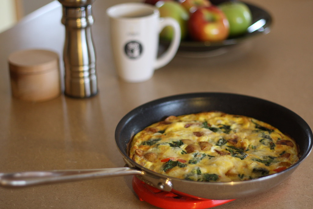 Фритата из овощей — отличный способ использовать остатки. Взбейте яйца, добавьте нарезанные овощи, немного сыра, приправьте солью и перцем, затем запеките.