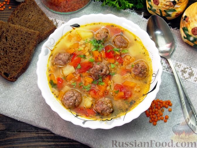 Чечевичный суп с овощами и мясными фрикадельками порадует своей густотой и насыщенным вкусом. Быстрое приготовление красной чечевицы сделает этот суп незаменимым в вашем рационе. Основные ингредиенты: чечевица, мясо, картофель, свежие помидоры, перец, лук, морковь и специи.