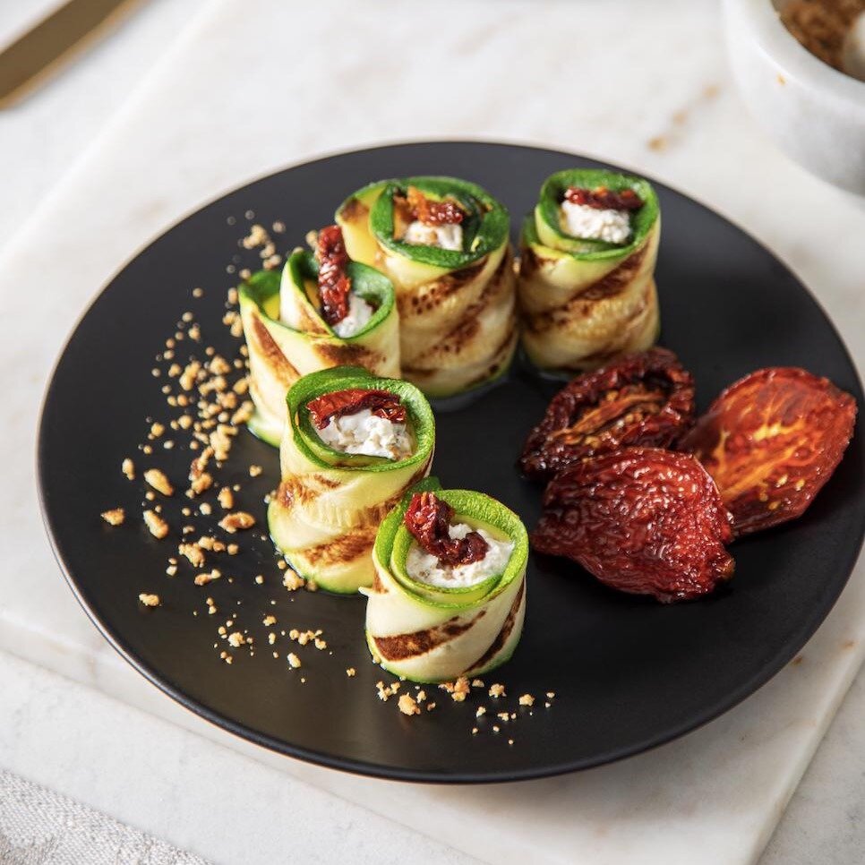 Цукини нарезать тонкими пластинами, приправить солью и перцем, оставить на 20 минут для удаления лишней влаги. Лучше всего использовать слайсер или мандолину для равномерной толщины.На сухой сковороде слегка обжарить кедровые орехи, периодически помешивая, затем остудить и измельчить в ступе или любым удобным способом.В отдельной миске соединить рикотту, мелко нарезанный базилик (или сушеные травы), одну столовую ложку оливкового масла, выдавленные зубчики чеснока и тщательно перемешать. Добавить орехи и перемешать еще раз.С помощью бумажных салфеток удалить лишнюю влагу с кусочков цукини. Обжарить их на гриле или на сковороде, смазанной оливковым маслом, до легкой золотистости.Обернуть сырной смесью каждый слайс цукини.Вяленые помидоры нарезать небольшими кусочками и разместить по одному на каждом ролле.Полезный совет