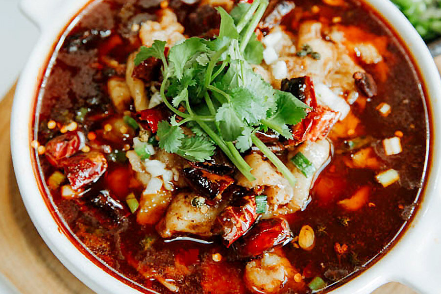 На медленном огне нагрейте сушеные чили-перцы в течение 30 секунд, затем добавьте сычуаньский перец и готовьте до появления аромата. Дайте остыть и грубо нарежьте.Соедините ингредиенты для маринада и тщательно перемешайте.Нарежьте рыбу тонкими ломтиками и замаринуйте на 30 минут. Перед готовкой добавьте кукурузный крахмал и хорошо перемешайте.Порежьте чеснок и имбирь, а лук на белые и зеленые части.В глубокой сковороде обжарьте пасту доубаньцзян в растительном масле, пока масло не станет красным. Добавьте имбирь, белую часть лука и половину чеснока, обжаривайте до появления аромата.Включите ферментированные бобы, сычуаньский перец и половину чили, готовьте еще 30 секунд.Влейте 4 стакана воды и дайте смеси покипеть 10 минут.В отдельной кастрюле бланшируйте ростки бобов около 1 минуты и выложите на дно сервировочной миски.Добавьте в бульон кусочки рыбы и готовьте 3 минуты. Переложите рыбу на ростки бобов.Залейте бульон в миску через сито.Сверху украсьте оставшимся чили, чесноком и зеленым луком.Нагрейте пару столовых ложек масла и аккуратно вылейте на начинку. Блюдо готово к подаче!Приятного аппетита!