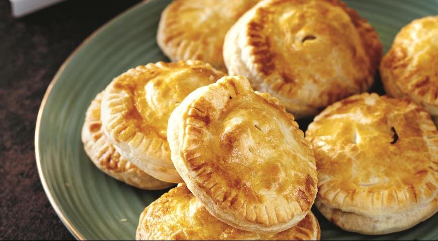 5. Выпекание: Переложить подготовленные пирожки на противень, смазать яйцом и сделать по два прокола для выхода пара. Выпекать в духовке 20 минут, до золотистого цвета. Пирожки можно подавать теплыми или остывшими.