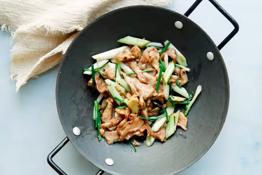 Нарезать лук (белую и зеленую части) длиной 3-4 см, чеснок и имбирь измельчить.Свинину нарезать на кусочки толщиной 4-5 мм. Вместе с молотым перцем, устричным соусом, крахмалом и водой тщательно перемешать. Добавить кунжутное масло, оставить мариноваться на 10-15 минут.Разогреть сковороду на среднем огне, обжарить белую часть лука около 2 минут до легкого румянца, затем переложить на тарелку.В сковороду влить растительное масло, дайте ему нагреться. Выложить кусочки свинины и обжаривать, помешивая, до изменения цвета.Кусочки свинины отодвинуть к краям сковороды, добавить имбирь, чеснок и ферментированные бобы. Обжаривать до появления аромата. Вернуть белую часть лука, перемешать и жарить еще минуту. Добавить зеленую часть лука, перемешать и снять с огня.Приятного аппетита!