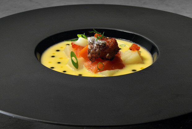 В глубокой кастрюле растопить сливочное масло на медленном огне. Добавить кости, тщательно очищенные от остатков рыбы и кожи, и обжарить несколько минут.Влить молоко, добавить сливки, свежий укроп, перец чили и лавровый лист. Готовить на медленном огне 30 минут, после чего дать остыть в течение часа при комнатной температуре. Затем процедить бульон, чтобы получить около 1,2 литра жидкости, и добавить соль.Картофель, морковь и лук нарезать мелкими кубиками. Снова поставить бульон на плиту, довести до кипения и аккуратно добавить сначала картофель, затем морковь и, последним, лук.Филе лосося, очищенное от жира и темных участков, нарезать кубиками и добавить в кипящий суп. Дать провариться одну минуту и выключить огонь.Подавайте суп, украсив его стружкой черного хлеба, свежим укропом и каплями масла — это придаст блюду особую изюминку!Пробуя этот суп, можно навести мостик между простотой домашних рецептами и ресторанным уровнем. Не упустите возможность порадовать себя и близких этим кулинарным шедевром!