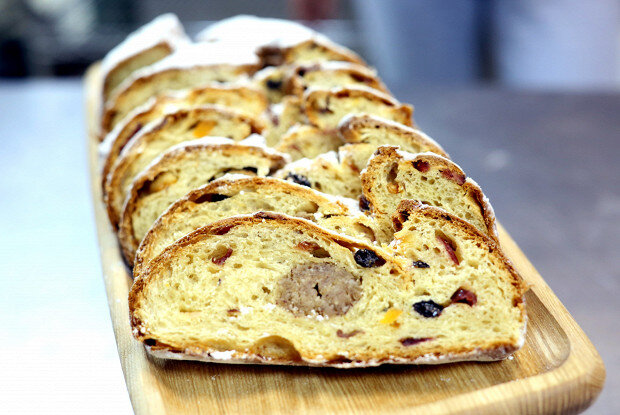 Подготовка сухофруктов: Замочить их вместе с лимонной цедрой в коньяке на ночь. В отдельной миске смешать яйца, холодное молоко и мед, добавить дрожжи, немного соли и специи.Замес теста: Всыпать муку с высоким содержанием белка и замешивать на низкой скорости до образования комка. Если тесто слишком сухое, добавить немного молока, а затем продолжить замес на более высокой скорости.Добавление масла: Когда тесто станет гладким, ввести нарезанное кубиками масло, добавляя его постепенно, чтобы тесто смогло его впитать.Формирование штоллена: После того как тесто станет эластичным, смешать его с заранее подготовленными сухофруктами и оставить подниматься на 30-40 минут, затем повторить процесс.Запекание: Сформировать из теста прямоугольник, добавить марципан и завернуть тесто. Оставить на час, затем выпекать в заранее разогретой до 170-180 градусов духовке в течение 30 минут.Подача: Готовый штоллен смазать горячим сливочным маслом и посыпать сахарной пудрой. По желанию можно украсить ягодами, орехами или цукатами.Создайте уютную атмосферу на праздники с этой замечательной выпечкой! Никакие праздничные угощения не смогут сравниться с нежным вкусом домашнего штоллена.