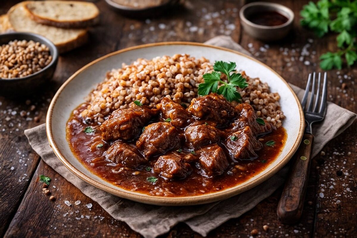 6. Тушить 1,5–2 часа до мягкости говядины и загустения соуса. Параллельно приготовить гречку, следуя простому рецепту: промыть, залить водой, добавить соль и небольшую ложку масла, варить до впитывания жидкости.