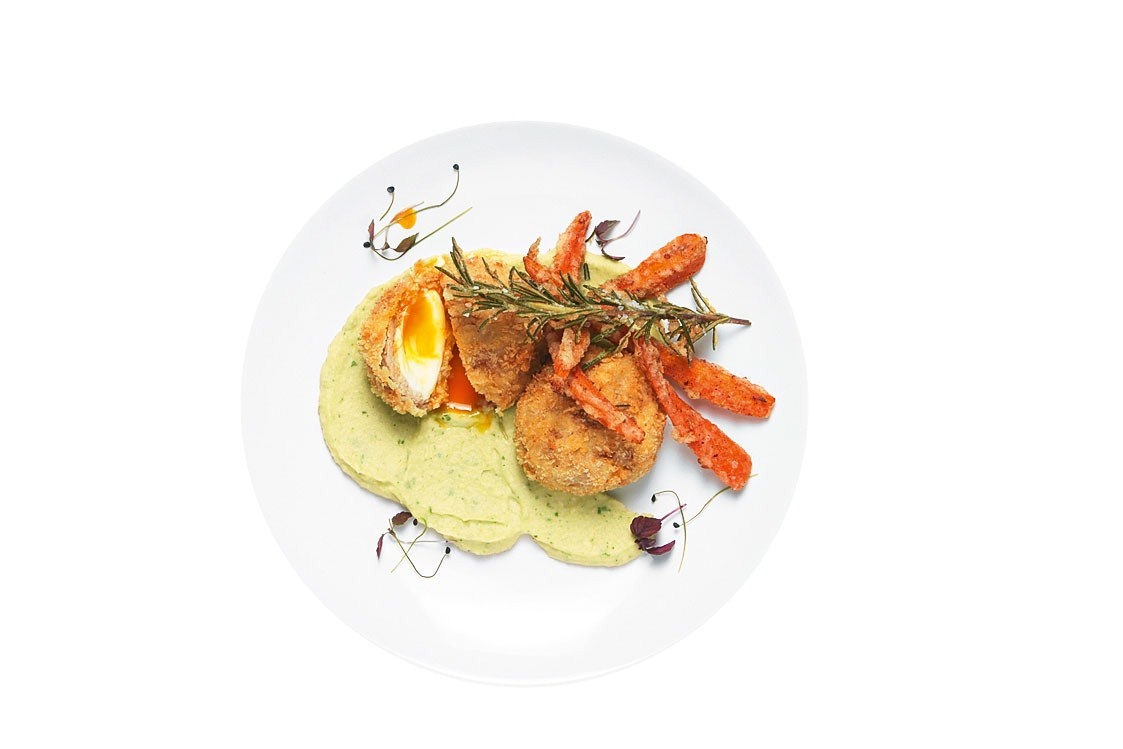 Сначала подготовьте яйца. Погрузите их в кипящую воду и варите 4 минуты. Затем остудите в холодной воде, аккуратно очистите.Смешайте оба вида фарша и тертый сыр в блендере, затем добавьте тимьян, горчицу, кайенский перец, нарезанный лук, молоко, соль и перец. Замесите до липкой консистенции.Разделите смесь на 8 частей. Распределите каждую часть между слоями пленки, поместите яйцо в центр и оберните фаршем.Для кляра смешайте муку с водой и солью, добавьте лед. Охладите в холодильнике на 30 минут.Для панировки используйте три миски: с мукой, взбитыми яйцами и хлебными крошками. Обваляйте бомбочки в муке, затем в яйце и крошках.Разогрейте масло в сотейниках до 175-180 градусов. Обжаривайте бомбочки до золотистого цвета, подайте разрезанными овощами или пюре из сельдерея.