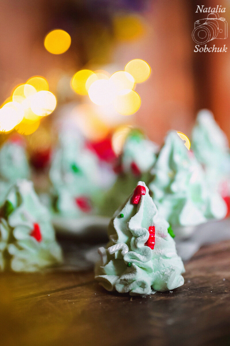 С помощью насадки с закрытой звездочкой формируются ёлочки на застеленной бумаге для выпечки, которые можно украсить кондитерской посыпкой. После этого ёлочки оставляют на ночь для стабилизации, а затем посыпают сахарной пудрой.