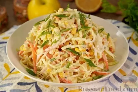 - Капустный салат с огурцами и крабовыми палочками — свежесть и лёгкость в каждой ложке. Заправляется ароматным растительным маслом с добавлением лимона и чеснока.