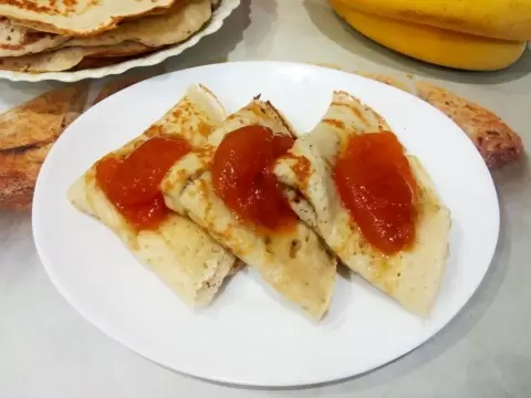 Блины получаются невероятно нежными и ароматными благодаря добавлению бананов и дрожжевому тесту. Готовя их, можно экспериментировать с начинками или подавать с различными сладкими соусами. В этом рецепте накрываются блины абрикосовым вареньем, что придает дополнительный вкус.