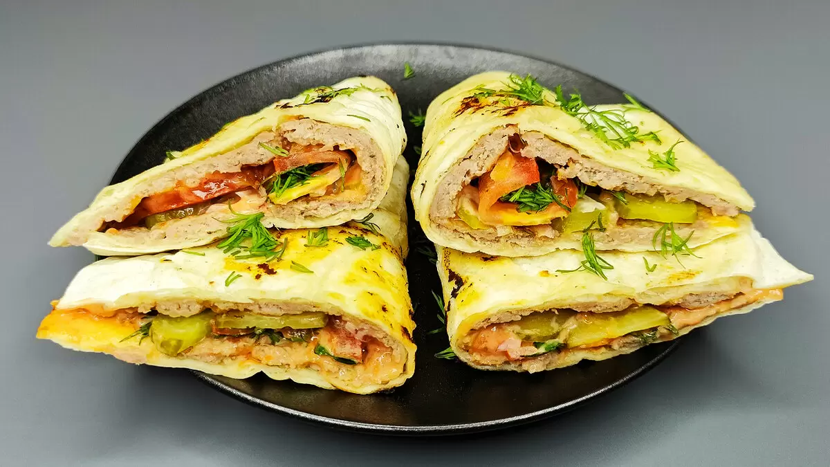 3. Подготовка начинки: Пока лепешка жарится, нарезать салатный лук полукольцами, маринованный огурец и помидор тонкими кружочками, мелко нарезать укроп и черемшу. В отдельной посуде смешать майонез и кетчуп, чтобы получилась однородная масса.