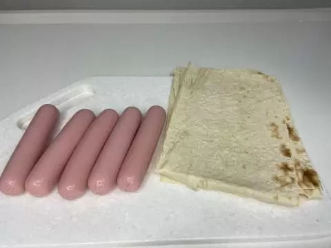 Лаваш нарезается на прямоугольные кусочки шириной, соответствующей сосискам. Далее, его нужно смазать плавленым сыром, маслом или любимым соусом. На край лаваша кладется кусочек сыра и сосиска, после чего аккуратно заворачивается.