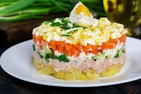 Салат собирается поэтапно. Каждый слой, кроме первых двух, будет покрыт легкой сеточкой майонеза. Следуйте инструкциям: