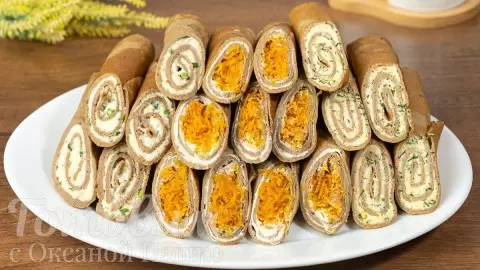 2. Овощная начинка: Обжарьте лук до золотистого цвета, добавьте тертую морковь и тушите до мягкости. Перемешайте с чесноком и заполните блинчики.