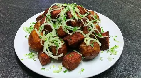 Спустя час казан-кебаб будет готов. Аккуратно выложите его на блюдо, сначала разместив мясо, а затем картофель. Украсить блюдо можно полукольцами лука и свежей зеленью. Такое угощение станет настоящим украшением праздничного стола и точно порадует ваших гостей своими вкусами!